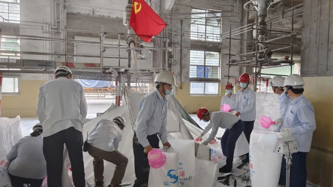 公司党委书记宋虎堂迅速组织各党支部的党员、团员以及员工共53人,成立了9支党员突击队分批支援聚丙烯产品线人工包装。
