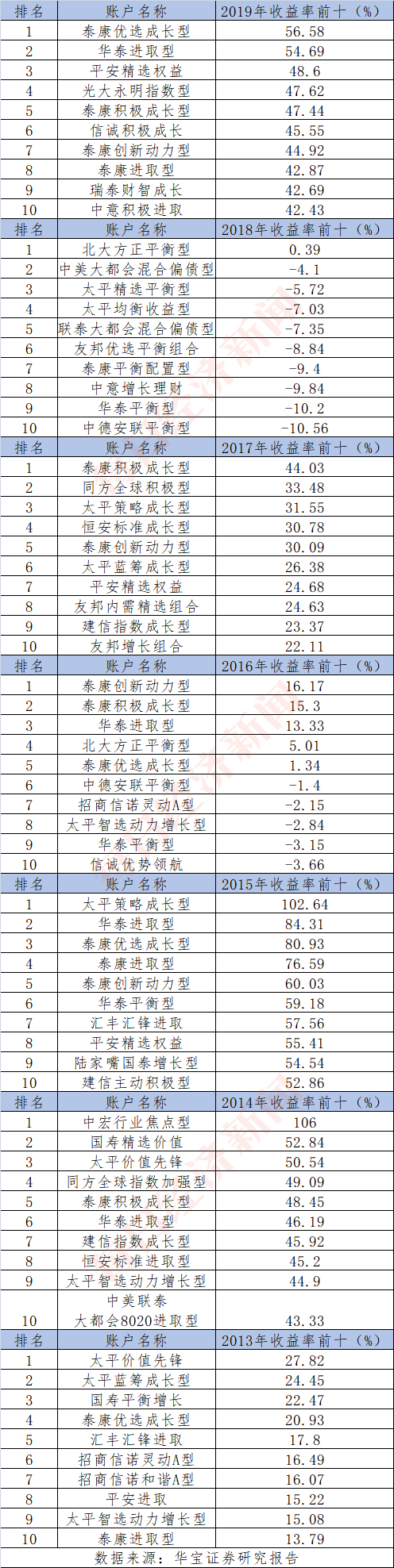 上述账户有6个激进型账户(投资股票基金比例在80%以上)、3个混合激进型(投资股票基金比例为50%~80%)、1个指数型账户(采取指数化策略)。