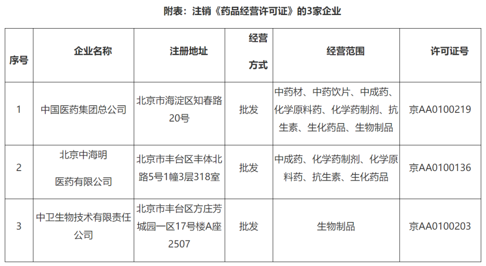 北京市药品监督管理局7月30日发布公告称,根据《中华人民共和国药品管理法》和《中华人民共和国行政许可法》的有关规定,中国医药集团总公司等3家企业《药品经营许可证》有效期届满未换发《药品经营许可证》,依照《药品经营许可证管理办法》第二十六条,应予以注销。