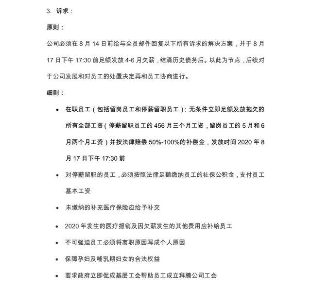 此次维权员工的主要诉求是,希望公司在8月17日下午5点半前足额发放拖欠的薪资(停薪留职员工的4月、5月和6月三个月的工资,留岗员工的5月和6月两个月工资),并在上述时间前按照法律规定赔偿员工50%-100%的补偿金。