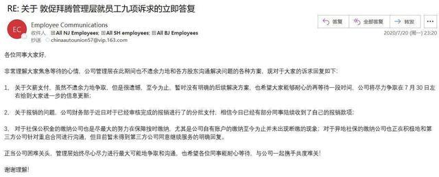 未来汽车日报了解到,7月中旬,相关拜腾汽车员工曾向公司董事会发邮件询问拖欠工资何时支付,拜腾汽车HR方面在回复员工的邮件中表示,争取在7月30日左右给到进一步信息更新。但是拜腾汽车员工反映称,7月30日没有收到官方回复。