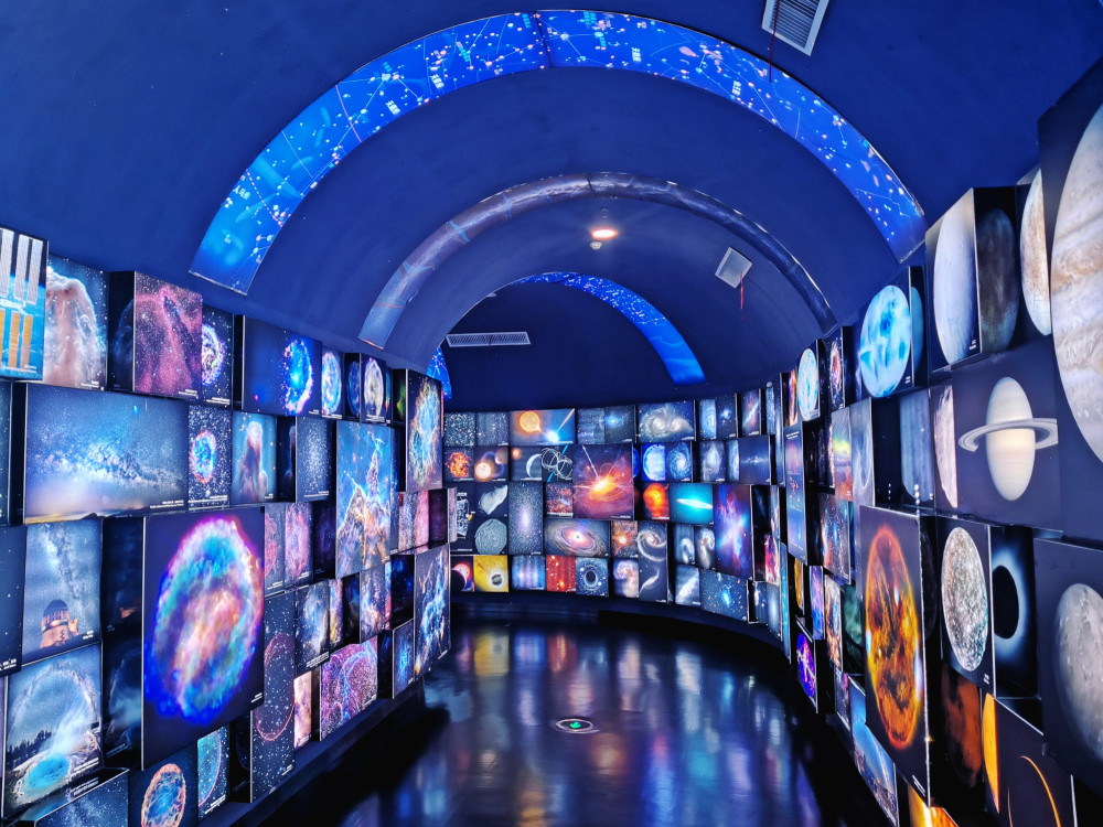 接着走到了宇宙展厅,入口处宛如星空隧道,恒星、行星,闪烁着灯光,仿佛把整个太阳系“搬”到了馆内。
