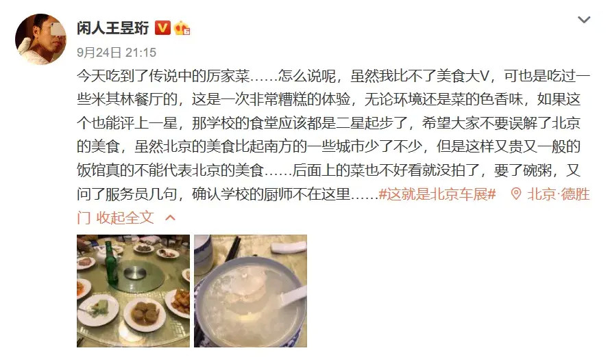 日前,号称“宫廷风味菜”的厉家菜,被指因菜价贵、菜品“差”被网友喷上了热搜。靠最强大脑一战成名的“水哥”王昱珩在吃过厉家菜后,发图表示,“这是一次非常糟糕的体验,无论环境还是菜的色香味,如果这个也能评上一星,那学校的食堂应该都是二星起步了”。