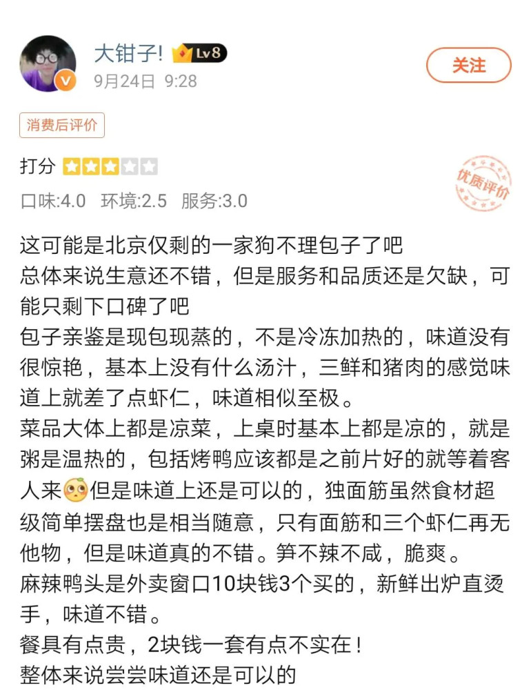 同在9月因“口味差”而被送上热搜的还有老字号狗不理包子。9月15日,微博大V在探访狗不理包子北京王府井总店后表示“酱肉包特别腻、没有用真材实料;而猪肉包则是皮厚馅少,面皮粘牙”。此外,他还对该店的服务、价格等进行了点评。