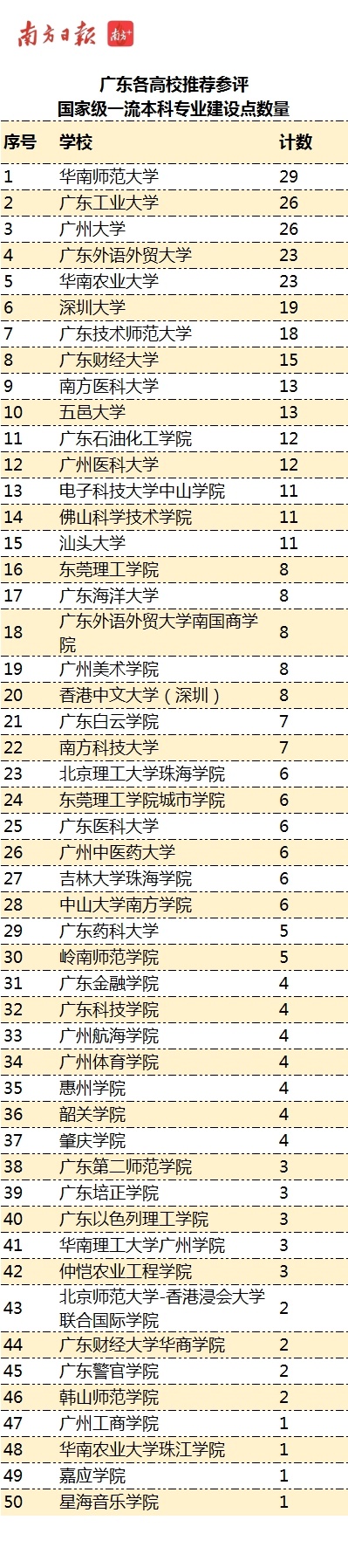 南方教育智库第一时间分析发现,此次广东共有50所高校184类专业获得推荐参评。