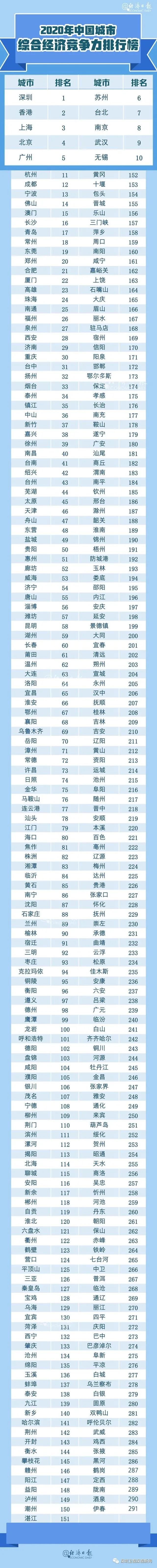 报告显示,2020年城市综合经济竞争力指数10强依次是:深圳、香港、上海、北京、广州、苏州、台北、南京、武汉和无锡。