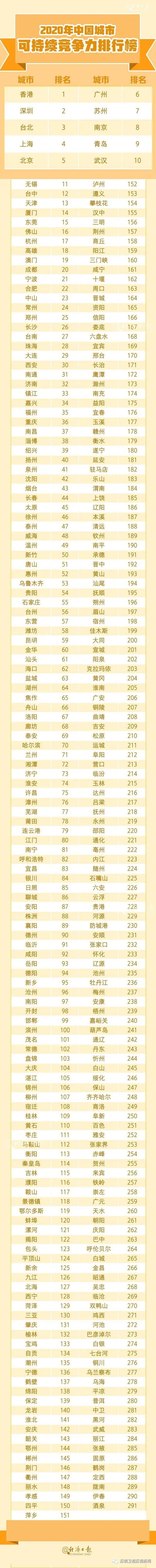 2020年中国可持续竞争力指数10强依次是:香港、深圳、台北、上海、北京、广州、苏州、南京、青岛和武汉。