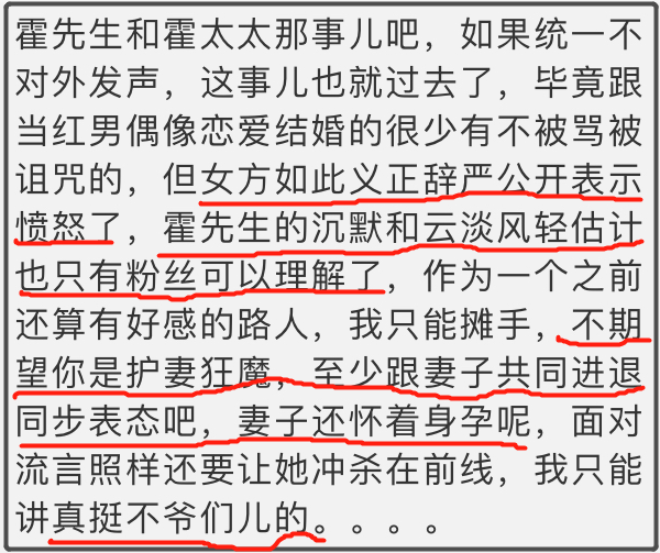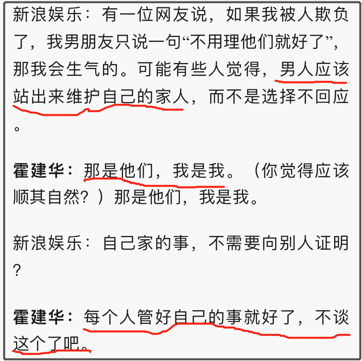 很多人说这样区别对待答案呼之欲出,不爱罢了。但八八却觉得未必,霍在事业转型期,面临人生这道大坎,个中复杂情绪,非“不爱”二字可以草草解释的,否则,事业巅峰期宣布结婚,他不会不知道潜藏风险,却还是选择这么做了。