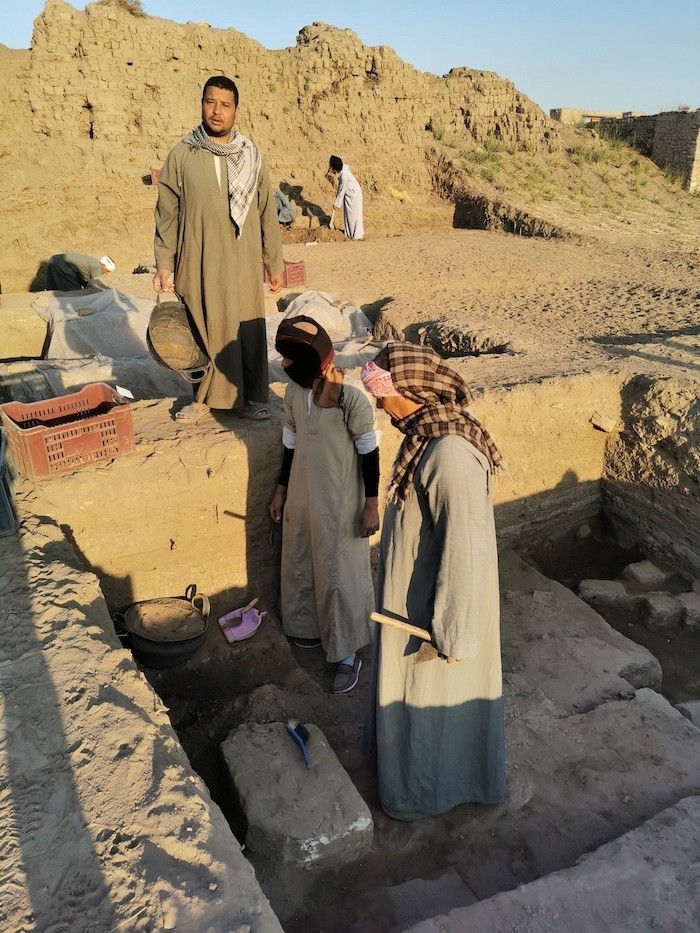 中国考古队在2019年至2020年发掘季布设的探方面积约两千平方米,发掘工作主要集中在南围墙处的奥西里斯小神殿区和孟图神庙西南角与玛阿特神庙相连的区域。神庙区到处是来自不同建筑的石块,大部分有铭文的石块由法国考古队整理并放在一处,因为年代久远,不仅基本信息无从考证,而且因长期与土壤接触被逐渐腐蚀,出现了开裂、风化现象。因此,中国考古队建造了水泥平台,将铭文石刻置于平台上,采用统一的石块铭文记录表进行编号、登记和拍照,为日后项目资料库保存影像材料与信息,目前已登记在册的石块约有五百块。另外,中国考古队已经开始与卡尔纳克修复中心合作,在发掘的同时,对文物和建筑进行必要的修复和加固,采取充分的保护措施。除此之外,中国考古队还与法国东方考古研究院和米兰大学建立联系,目的是查阅法国考古学家当年所做的考古笔记、器物卡片和信札。