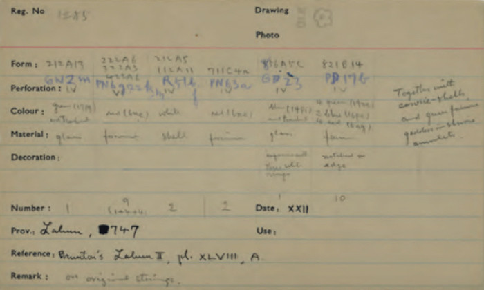 到了1915年,皮特里埃及考古博物馆已经拥有大约三千串串珠,这在全世界公立博物馆或私人收藏中都是绝无仅有的。它们不仅数量多、种类齐全,而且分布在古埃及各个历史阶段。这些串珠能够提供许多有关古埃及人社会身份、古埃及工艺和对外贸易的信息。其中由皮特里亲自发掘的串珠都配有相当详尽的出土信息,而其他串珠是皮特里在埃及各地的文物市场购得的,它们几乎没有任何出土信息。如何以科学的手段对这些数量巨大却珍贵的微小串珠进行科学的解读,实在是令皮特里头痛的事情。皮特里一直忙于考古发掘,并且在最短的时间内出版发掘结果,但是没有时间和精力对来自不同墓地、区域并属于不同年代的串珠进行细致的、综合性的对比研究。皮特里曾经希望他的学生们能够承担这份艰难却非常有意义的研究工作,但是根据夸克教授的说法,许多学生在不同场合表示,给这些不起眼且又相似度极高的串珠进行分类、解读和分析,这项工作远比处理其他出土物都繁琐。