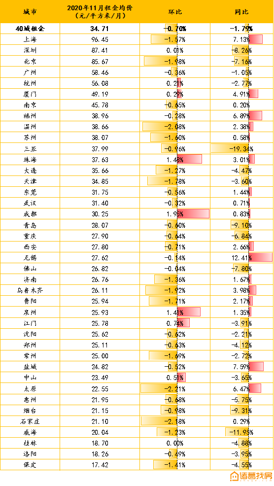 诸葛找房数据显示,11月,全国40大中城市租金挂牌均价为34.71元/平方米/月,创下2019年1月以来的新低。