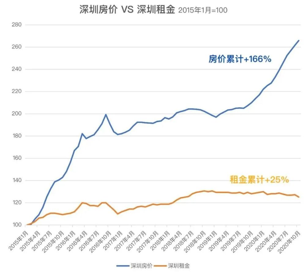 从历史周期来看,深圳房租涨幅远远跑输房价。
