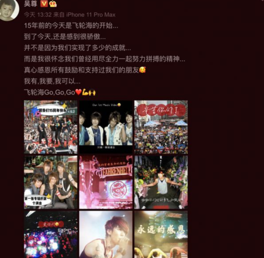 就在这么一个特殊的日子,吴尊、辰亦儒、汪东城也依次发文庆祝组合纪念日,一方面感叹时光匆匆,另一方面也感叹物是人非。(毕竟四人中就剩下炎亚纶没有发文祝贺,显而易见是想要撇清关系....)