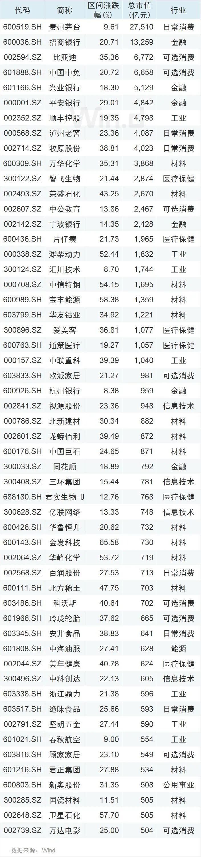 从创新高公司股价表现来看,有54家公司总市值超过500亿元,千亿市值以上的亦有23家,其中茅台、招行、比亚迪、中国中免、兴业银行、平安银行(000001)、顺丰控股、泸州老窖、牧原股份、万华化学、智飞生物、荣盛石化、中公教育、宁波银行等公司市值在2000亿元以上。多家大市值公司今年以来涨幅甚至超过50%。(剔除11月以来上市新股)