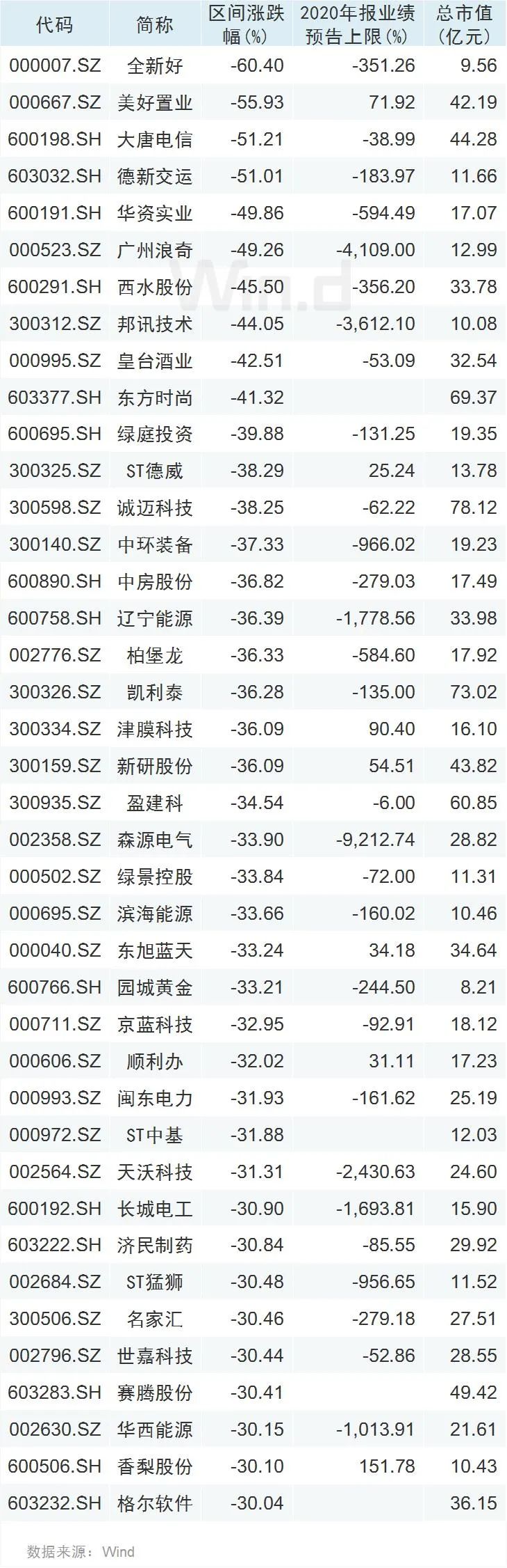 虽然有近200家公司股价创年内新高,但同时有600多家公司创2020年以来新低。从创新低公司股价表现来看,有40家公司今年以来股价跌幅超过30%,跌幅靠前绝大多数为业绩预告爆雷公司,同时多数跌幅较大的公司市值普遍低于50亿元。