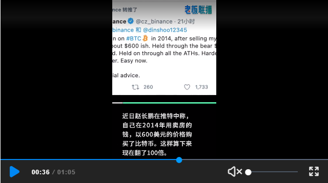3月14日,单枚比特币价格首次突破6万美元。中国币圈首富,区块链交易平台币安CEO赵长鹏在推特中称,他2014年用卖房的钱,以600美元的价格购买了比特币,将继续持有。