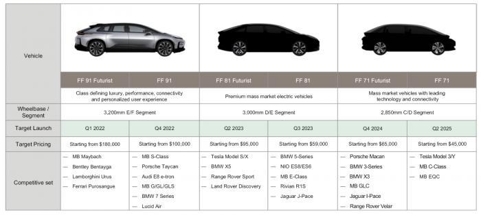 据悉,FF91的定位是高端豪华车,其对标的产品包括迈巴赫、宾利Bentayga、兰博基尼乌鲁斯、法拉利Purosangue、奔驰S级、保时捷Taycan、宝马7系等。按照FF的规划,其计划于2022年Q1先推出FF 91 Futurist车型,目标售价18万美元起,然后于2022年Q4推出FF 91车型,售价10万美元起。