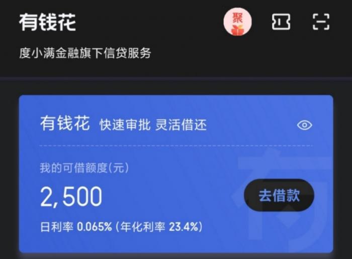百度集团旗下的度小满金融在其首页显示了可用额度和年化利率。借款额度为2500元时,年化利率为23.4%。