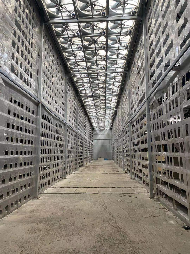 当前空荡荡的厂房内部,两侧是剪开的矿机散热孔