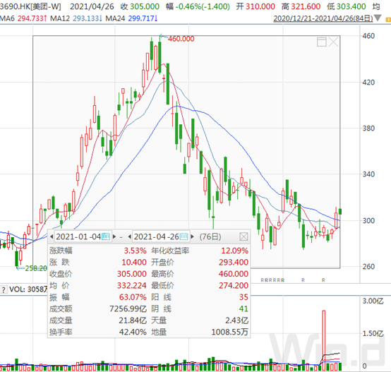 4月26日,港股美团微幅下跌0.46%,报收305港元,距离前期历史新高460元,已经下跌33.7%,市值蒸发超9000亿港元。基本抹平了今年以来的上涨,接近回到年初时股价水平。